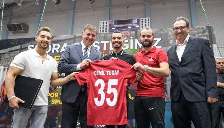 Törende İzmir Amatör Spor Kulüpleri Federasyonu Başkanı Efkan Muhtar, Başkan Tugay’a sporun gelişimine gösterdiği katkıdan dolayı plaket verirken milli sporcular ise Cemil Tugay yazılı 35 numaralı ay yıldızlı milli formayı hediye etti. Törene katılan sporcularla hatıra fotoğrafı çektiren Başkan Tugay, minik sporcuların formalarını imzaladı.